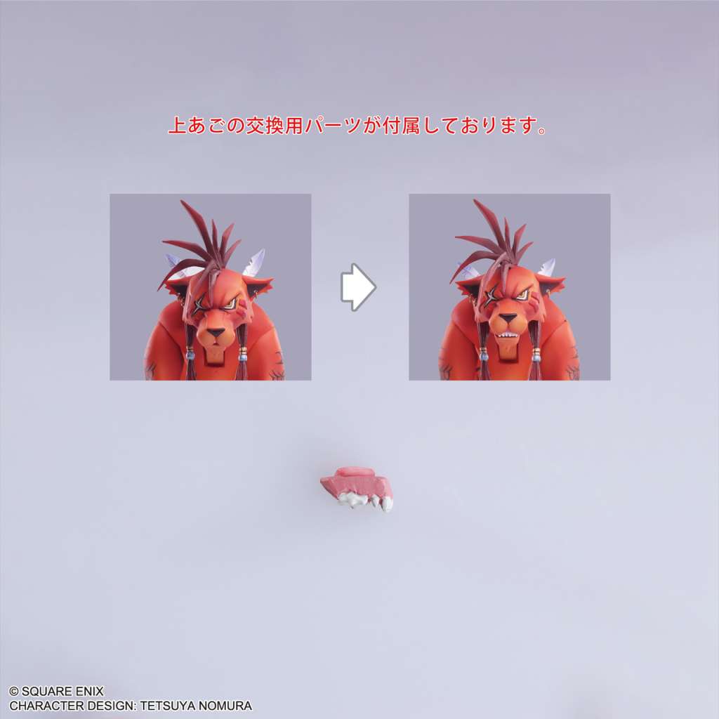 Accessoires narratifs : Red XIII est livré avec différentes expressions faciales (défiance, neutralité) et des mains interchangeables (s'il est représenté sur deux pattes ou avec un accessoire).